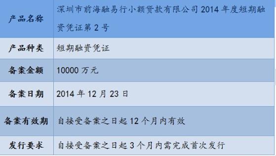 前海股权交易中心正式接受“深圳市前海融易行小额贷款有限公司2014年度短期融资凭证第2号”的发行备案。相关信息公告如下: