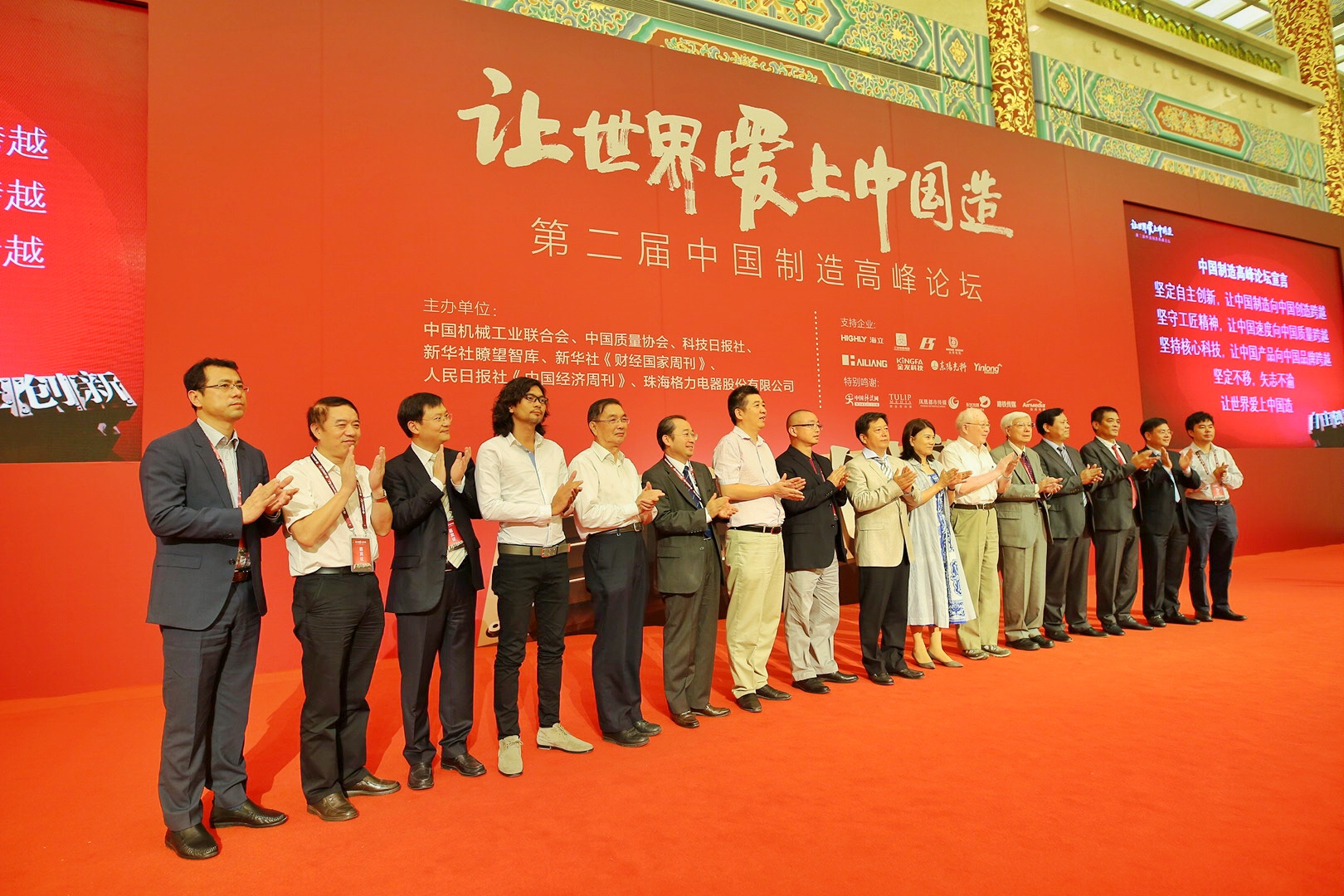 为积极响应习近平总书记“建设世界科技强国”的号召,推动中国制造业的创新发展,实现“两个一百年”中国发展战略目标。7月23日,第二届中国制造高峰论坛在人民大会堂金色大厅召开。人民日报社编委,新华社副社长,科技部党组成员,中国质量协会会长贾福兴,中国机械工业联合会会长王瑞祥,国务院参事张纲,国家发改委规划司司长徐林,中国工程院院士柳百成,格力集团董事长董明珠,悍高集团董事长欧锦锋,著名经济学家刘姝威等中国制造业各行业领军代表、政企学界精英等聚首一堂,以“让世界爱上中国造”为主题,“自主创新”为议题,携手发布中国制造创新宣言。
