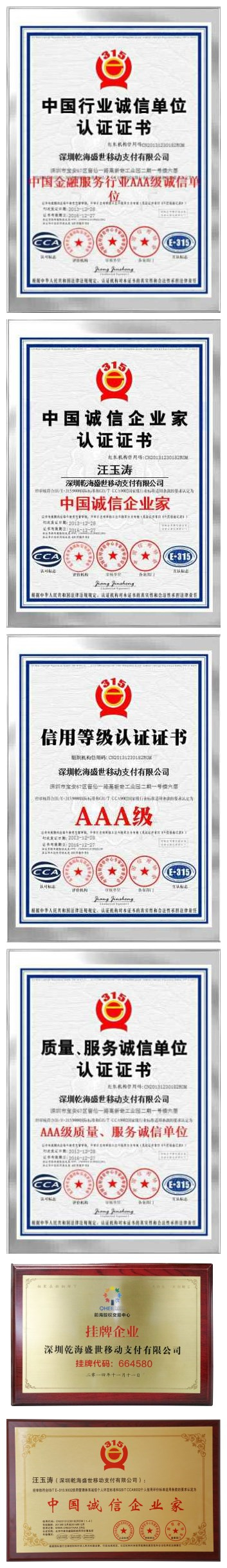 公司先后荣获中国行业诚信单位认证证书“中国金融服务行业AAA级诚信单位”,AAA级信用等级认证证书,AAA级质量服务诚信单位认证证书。公司董事长,英雄会创始人汪玉涛先生荣获中国诚信企业家称号。